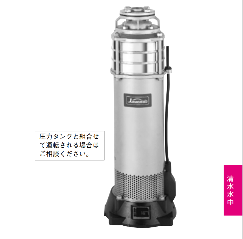| 發(fā)動機 | 屏蔽潛水電機 三相200V(55kW為400V) 同步 轉(zhuǎn)速 50Hz:3,000min-1,60Hz:3,600min-1 |
